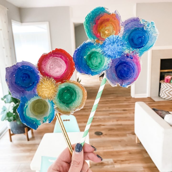 To make these festive flowers, simply cut an egg carton into three sections of four, paint the petals, then glue a paper straw or painted stick to the back. Have some pom-poms lying around the house? Add the finishing touch by glueing one in the middle of your flower.