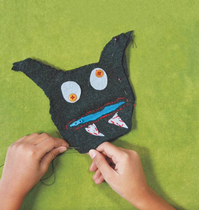 We love reaching into a monster’s mouth to get out our moolah—and we’re guessing you will, too! This is a fun, free-form project that lets you design your own pattern. If you don’t want to make a coin pouch, you can skip the zipper and stuff the pouch with polyester filling (or felt scraps) to make a cute-and-scary stuffie!